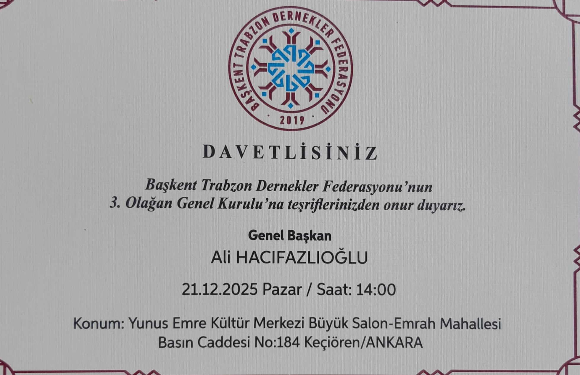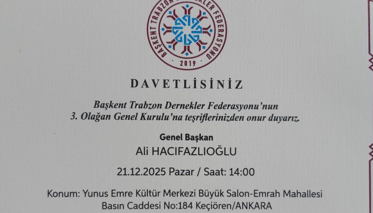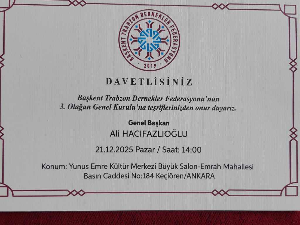 Derneğimizin kurucu ve üyesi olduğu Başkent Trabzon Dernekler federasyonunun 3. Olağan Genel Kurulu 21.12.205 tarihinde Yunus Emre Kültür Merkezi Büyük Salon Emrah Mahallesi Basın Caddesi No:184 Keçiören-ANKARA adresinde yapılacaktır.