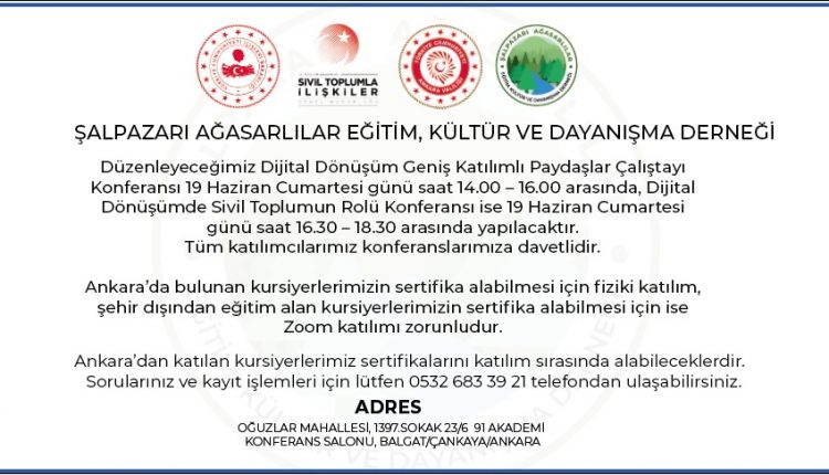 DİJİTAL DÖNÜŞÜM GENİŞ KATILIMLI PAYDAŞLAR ÇALIŞTAYI - Ankara Şalpazarı Ağasarlılar Eğitim Kültür ve Dayanışma Derneği Güncelleme: 17 Haziran 2021 Paylaş Adres: Oğuzlar Mah. 1397. Sk. 23/6, 06810 Çankaya/Ankara Google Konum çalıştaydijitaldönüşümdijitaldönüşümçalıştayı Paylaş FacebookTwitterGoogle+WhatsAppE-posta