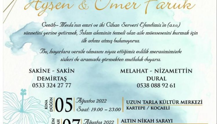 Geyikli Mahallesinden Diyanet işleri başkanlığında çalışan Dernek üyemiz Nizamettin DURAL’ın oğlu Ömer Faruk DURAL’ın 07 Ağustos 2022 (Pazar) saat 16:00’de Altın Nikah Sarayı Ziraat Mahallesi Ayça Sokak (Dışkapı Ssk Arkası) Altındağ-ANKARA adresinde ki düğününe tüm hemşerilerimiz davetlidir.
