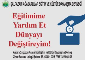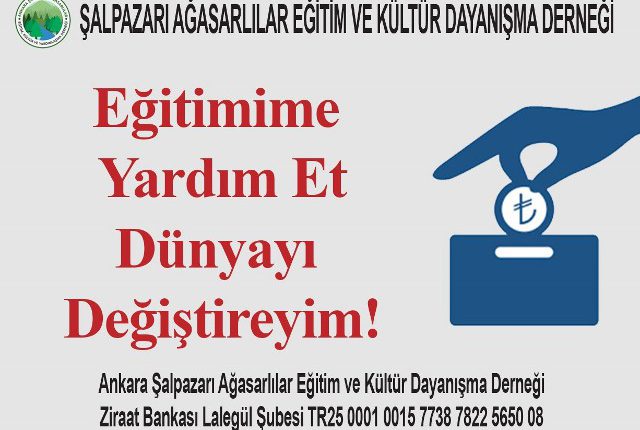 Ankara’da yaşayan Ağasar Şalpazar’lılar Yardımlaşma Derneğimizin üye ve gönüllülerine! Burs yaşam ve eğitime sahip çıkmaktır. 2019-2020 Eğitim Öğretim yılında ihtiyaç sahibi öğrencilerimize burs verilmek üzere imkanlarınız ölçüsünde düzenli bağışlarınızı (Burs olarak belirterek) aşağıda belirtilen banka hesap veya ıban numarasına yatırabilir ve dernek merkezi’ne makbuz karşılığı elden teslim edilebilirsiniz. Ziraat Bankası Ankara Lalegül Şubesi Şalpazarı Ağasarlılar Eğitim Kültür ve Dayanışma Derneği Hesap No: 38782256-5008 TR25 0001 0015 7738 7822 5650 08 Yönetim Kurulu